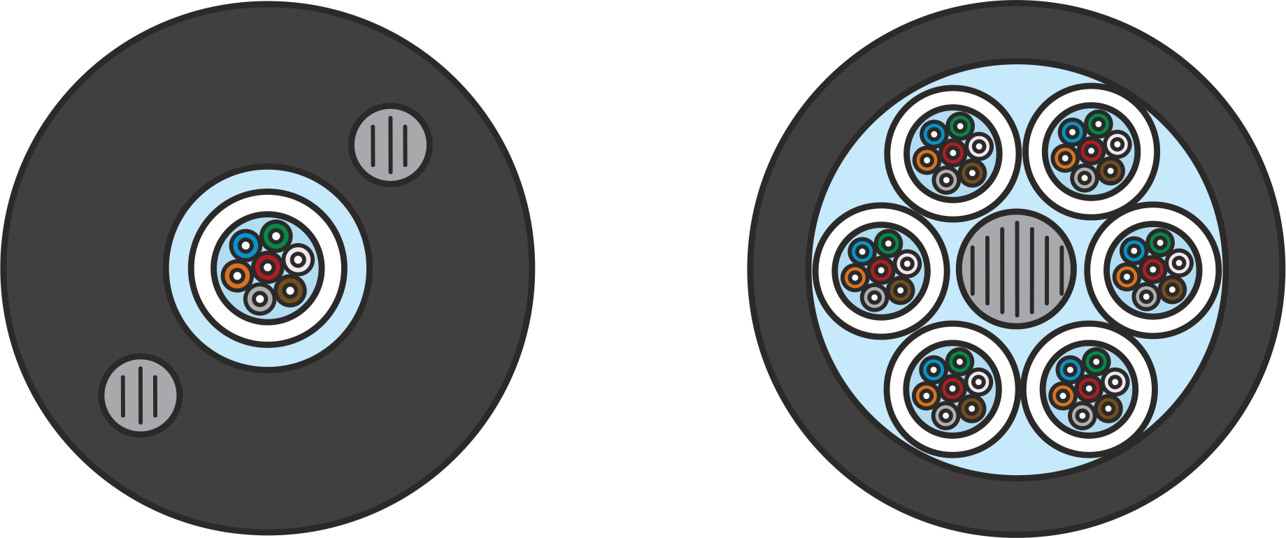 Второй тип — это кабель с трубчатой конструкцией. Как правило, в ней отсутствует центральный силовой элемент, все волокна находятся в центральной трубке (большом модуле), а внутри модуля содержится гидрофобный заполнитель.