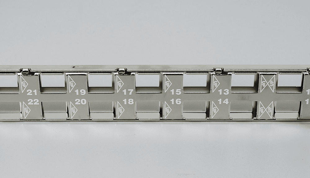 Честь наборных угловых панелей NIKOMAX защищают две модели: NMC-RP24-BLANK-AN-1U-MT и недавняя новинка NMC-RP24-BLANK-AG-1U-MT. Панели экранированные и при стандартной высоте 1U вмещают 24 модуля. Корпуса обеих моделей изготавливаются из стали 1,5 мм, поверх которых на соответствующем этапе производства наносится слой никеля. Иначе весь процесс называется гальваническим никелированием или гальванизацией никелем, благодаря которому продукт получает уйму полезных свойств. В их числе высокая коррозийная стойкость, прочность, лучшее экранирование от электромагнитных помех. Более того, благодаря гальванизации улучшается связь с неокрашенными направляющими шкафа, и, что немаловажно, панель приобретает изысканный серебристый перелив.