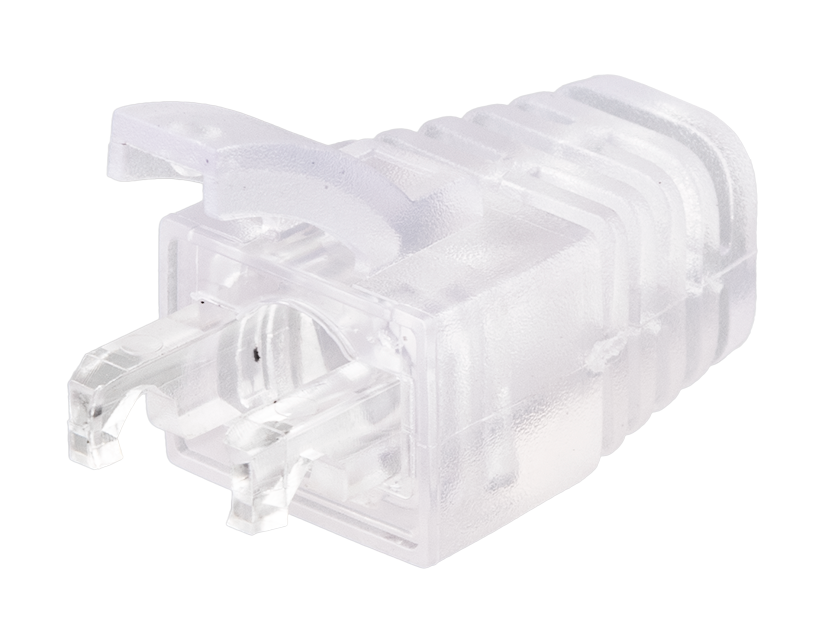 Буты, NMC-RJBOOT75T-TR-100 (с диаметром отверстия в 7,5 мм) и NMC-RJBOOT65S-TR-100 (с диаметром отверстия в 6,5 мм), изготовлены из прозрачного пластиката и подходят к кабелям любых цветов. Конструкция колпачка позволяет соблюсти правильный радиус изгиба кабеля, а также предусматривает защиту защелки, что в совокупности многократно увеличивает срок службы разъема и повышает удобство переключения.