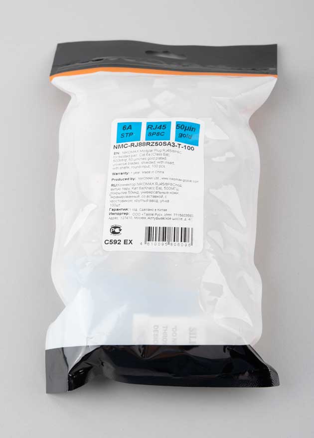 Коннекторы, NMC-RJ88RZ50SE3-T-100 (кат.6) и NMC-RJ88RZ50SA3-T-100 (кат.6а), выполнены в экранированном исполнении и имеют универсальный тип ножей – это позволяет использовать их для оконцевания как одножильных кабелей, так и многожильных (патч-кордовых) при производстве коммутационных шнуров. Дополнительное золотое покрытие (50 мкд) позволяет продлить срок службы и придает дополнительную защиту контактов. Более того, в комплект поставки входит набор специальных вставок для удобства разведения жил.