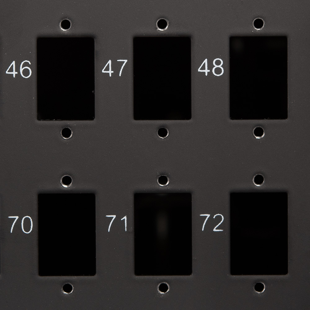 Взяли лист стали толщиной в 1,2 мм и максимально оптимально использовали его площадь, разместив на ней 72 посадочных места под адаптеры SC и LC. Каждый порт пронумерован. А для надежной фиксации адаптеров мы учли отверстия под винты, которые вложили в комплект поставки кросса. Итого получаем 72 SC- или 144 LC-порта.