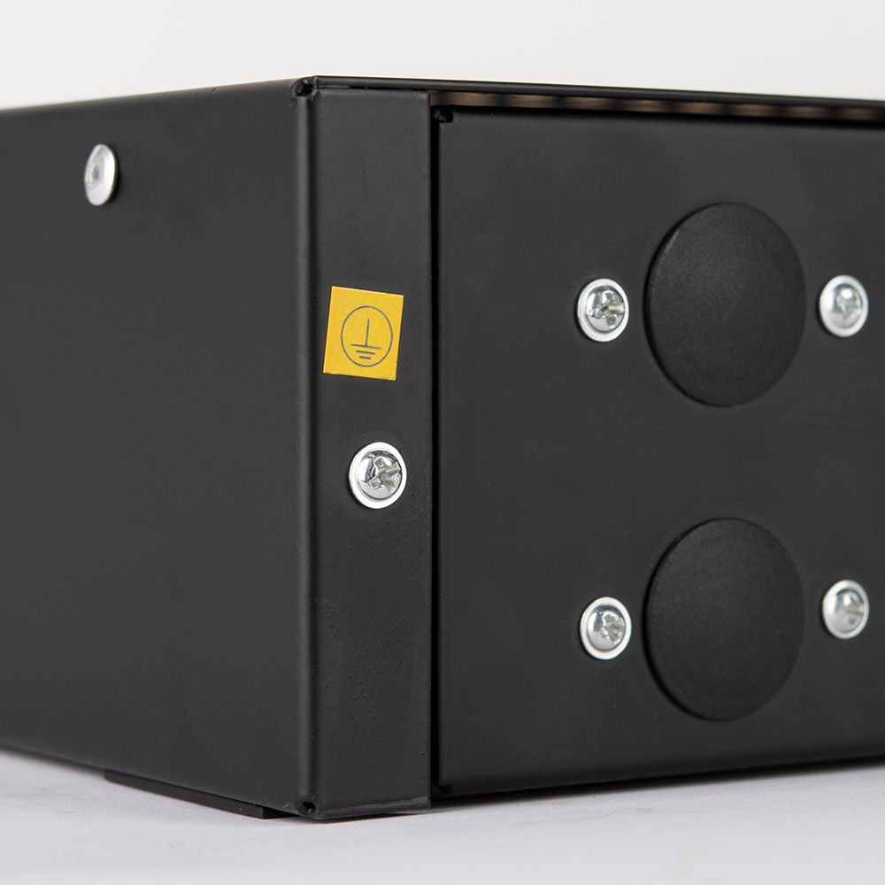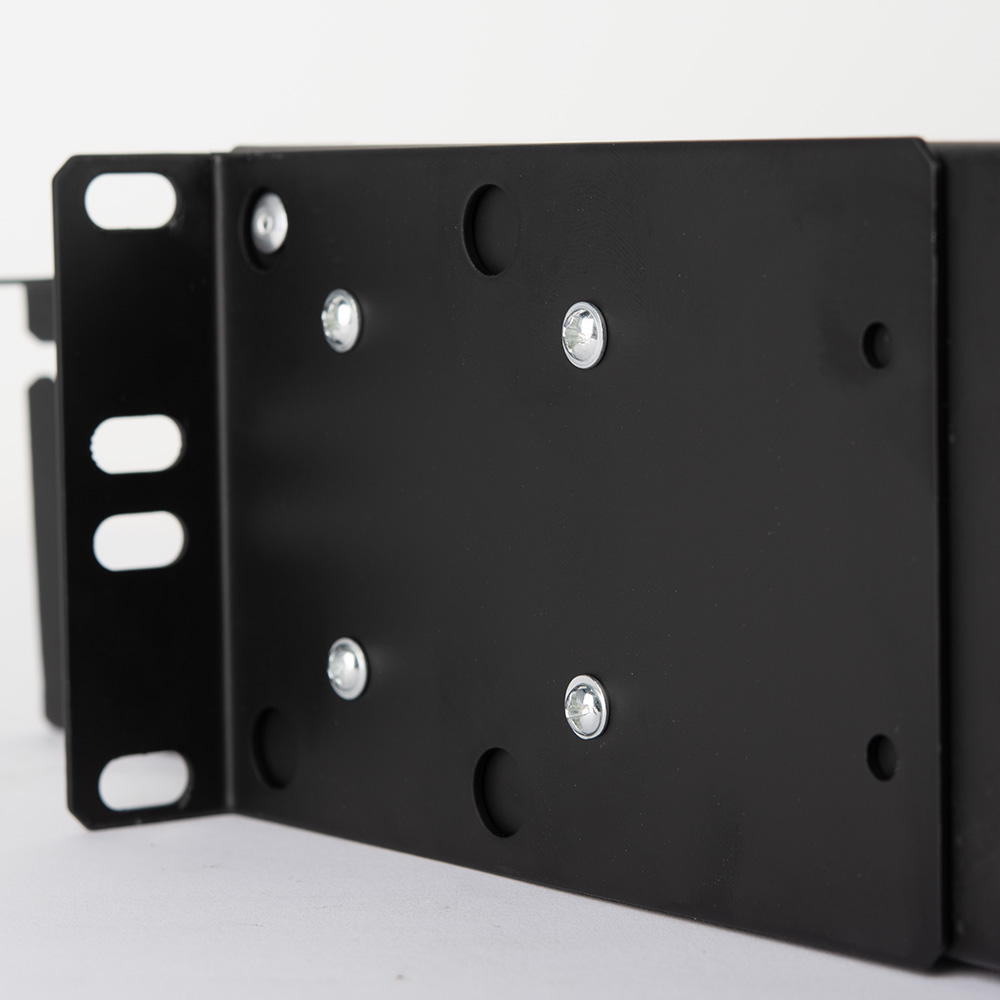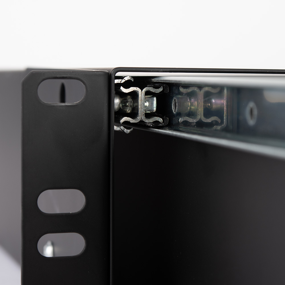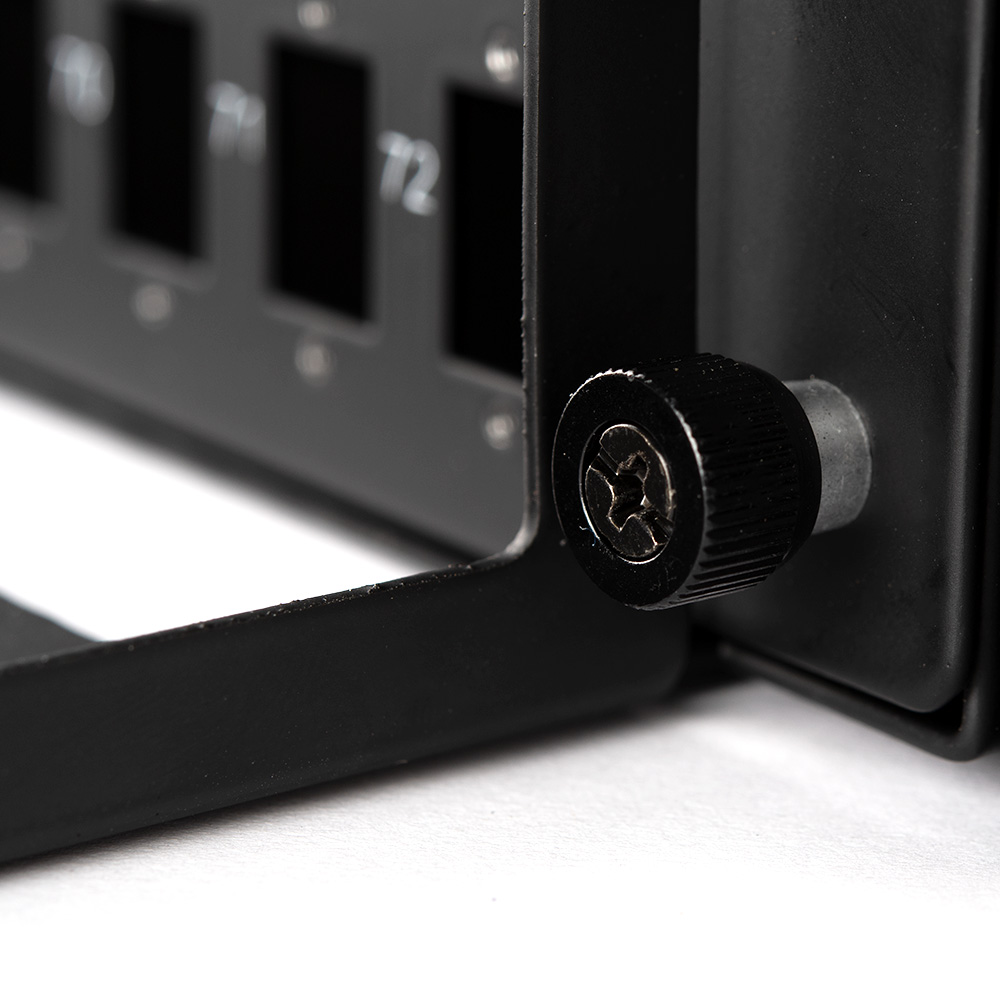 Выделяет кроссы Premium и съемная фронтальная полка. Но для 2-юнитовой модели мы ее несколько усовершенствовали, добавив с обеих сторон кольца для организации патч-кордов. Зафиксировать их можно с помощью стяжек и перфорации, вырубленной на полке.