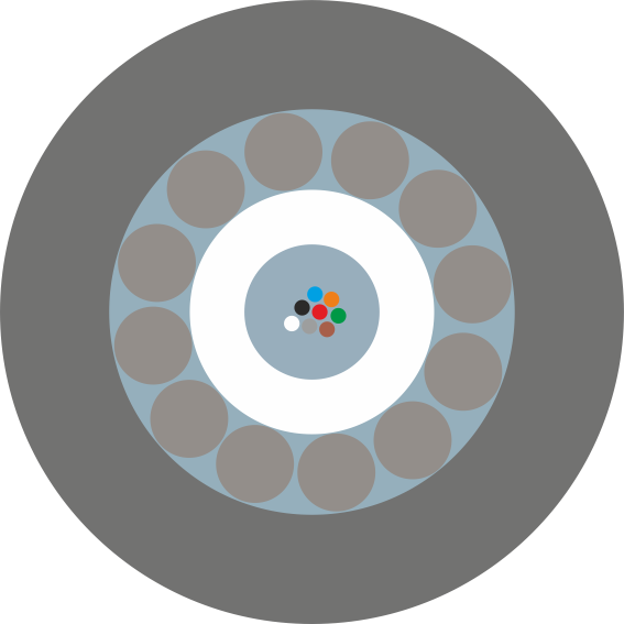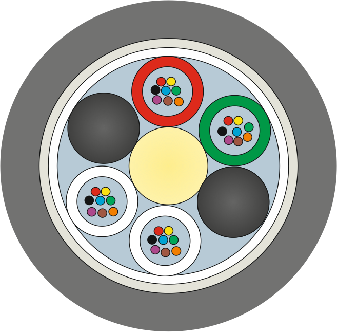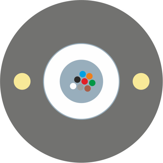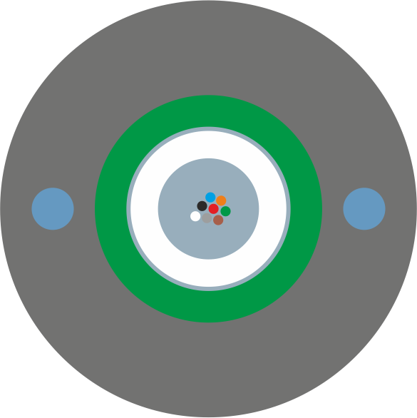 Кабель S серии содержит 6 оптических модулей со свободно уложенными волокнами. Является самонесущим, основная область применения – подвес. В качестве центрального силового элемента используется стеклопластиковый пруток. Поверх оптических модулей накладывается водоблокирующая лента и силовой элемент – стеклонити.