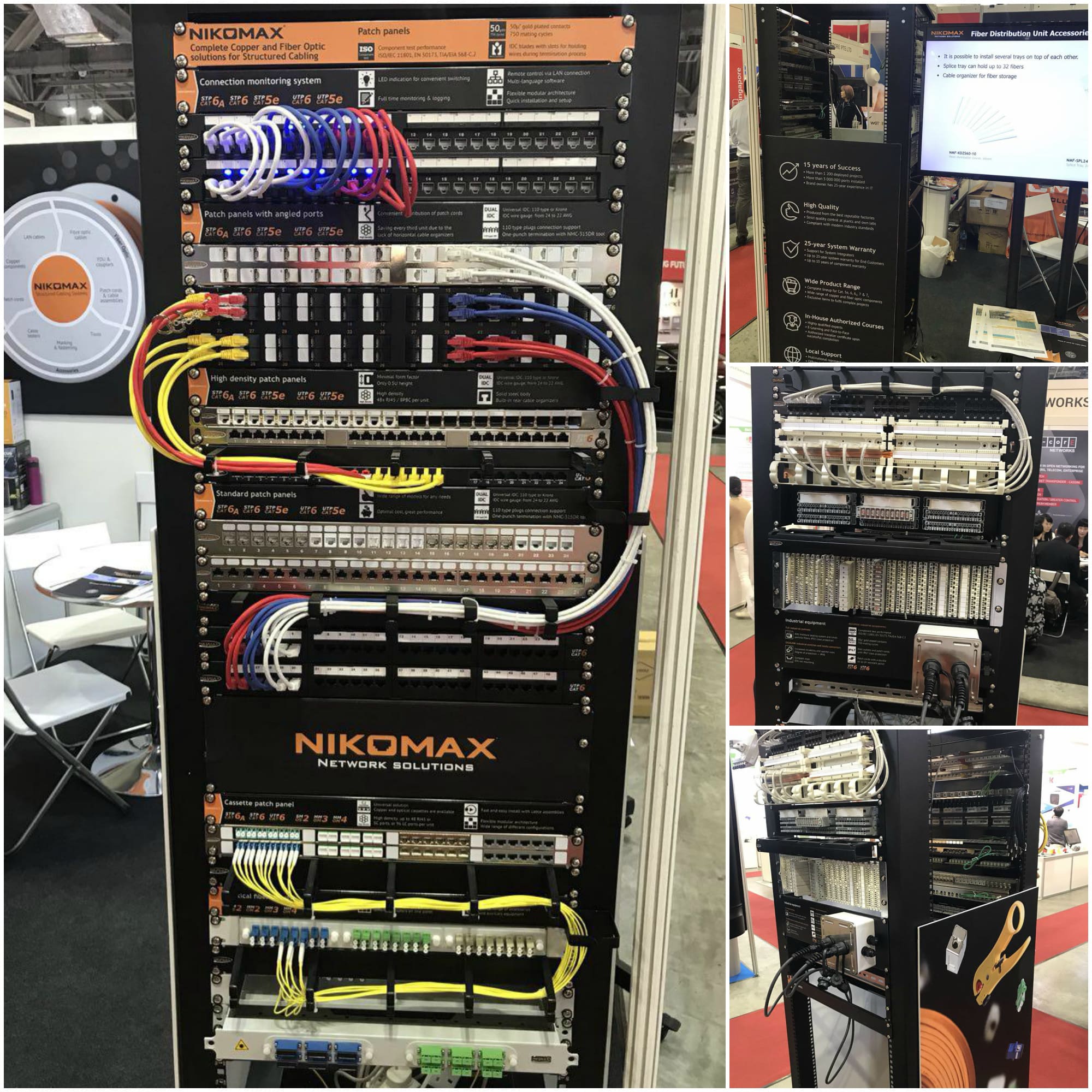 Верхние юниты - prime place - принадлежали системе мониторинга подключений (она же LED-система), существенно упрощающей жизнь системным администраторам. Еще один потенциальный хит на азиатском рынке - патч-панели с угловым расположением портов, позволяющие удобно выводить коммутационные шнуры в стороны и закреплять их на вертикальных кабельных органайзерах. Спускаемся ниже: патч-панели на 24 порта высотой в 0,5 юнита обеспечивают высокую плотность решения, позволяя разместить 48 портов всего в одном юните - критичный фактор для датацентров. Так, юнит за юнитом, от медных патч-панелей, кейстон-модулей и патч-кордов плавно доходим до самого низа стойки, где расположилась оптическая артиллерия NIKOMAX - кросссы, кассетные и MTP решения – готовые претерминированные сборки, которые могут быть оттестированы заранее и установлены на объекте в кратчайшие сроки.