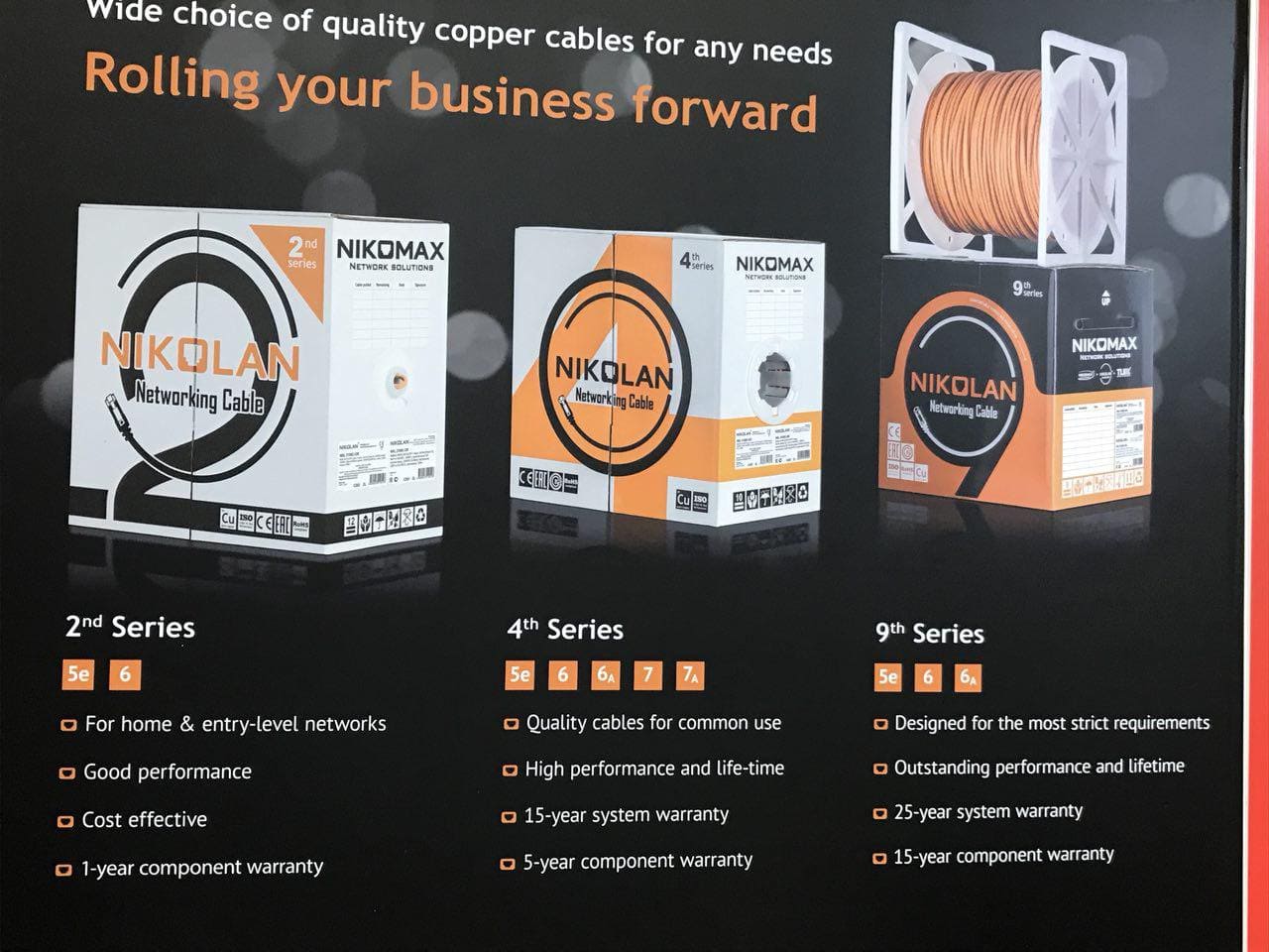Заслуженное внимание получили и три линейки кабеля NIKOLAN, наглядно представленные как на макете, так и в качестве реальных образцов. Флагманская 9 серия - это запас характеристик по всем параметрам, качество на уровне мировых кабельных брендов (мы ведь знаем все эти имена, не так ли? В Азии они столь же известны и даже более популярны, в России), системая гарантия 25 лет. Main-stream - 4 серия, дающая максимум продаж в России и претендующая на такие же лавры и в Азии за счет более низкой цены при сходном с предыдущей серией качестве. Плюс максимальный ассортимент - с 5е по 7А категории. И системная гарантия 15 лет. А вот 2 серия - это пока сюрприз для России - на родине она еще не анонсирована, а первые поставки начнутся в августе 2018. Это кабель с более тонкой (но остающийся в пределах 24AWG) жилой, спозиционированный для чувствительных к цене заказчиков, не готовых при этом жертвовать качеством.