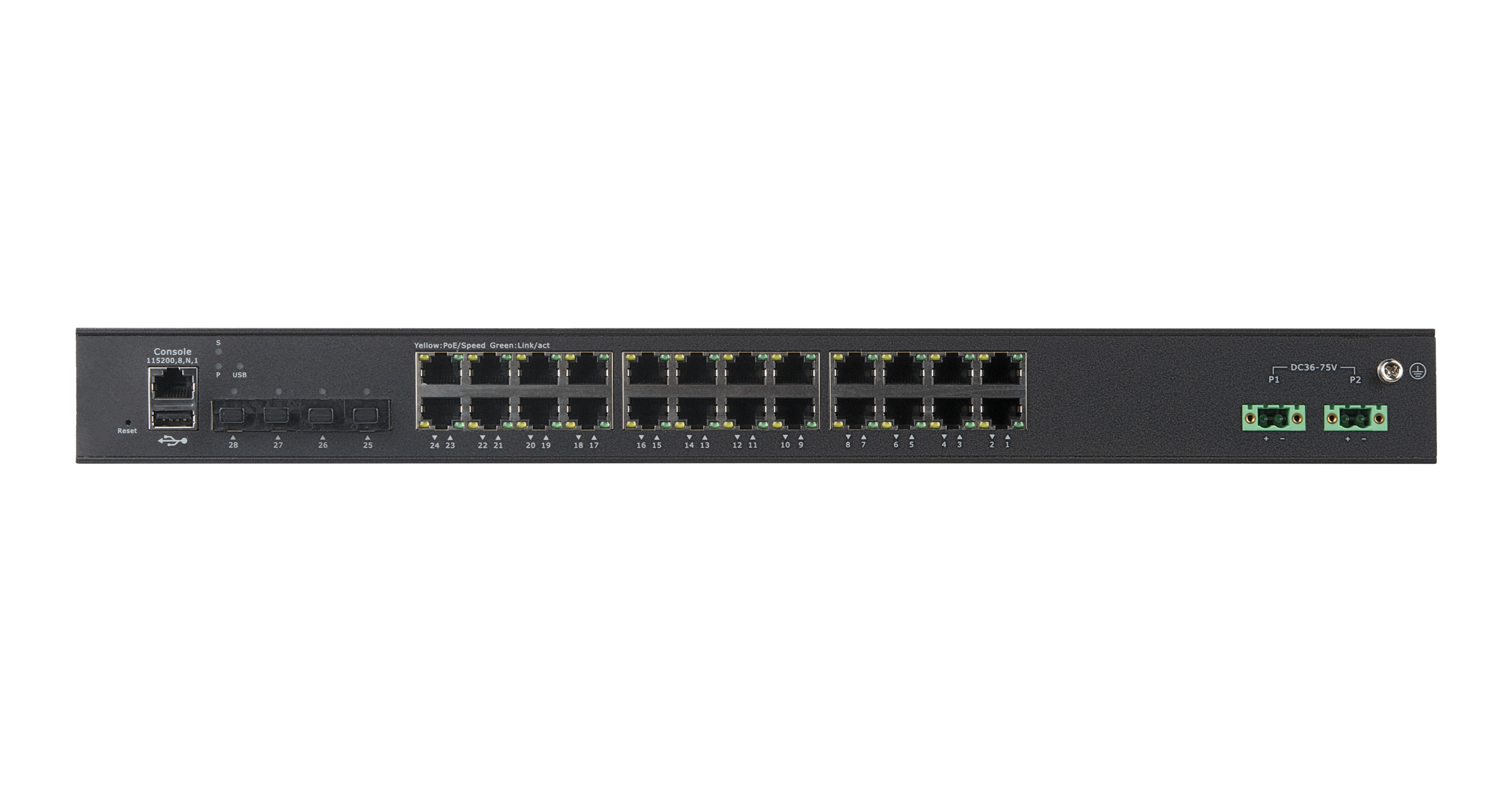 Управляемый промышленный L2+ коммутатор NIKOMAX, 24*10/100/1000Base-T, 4*1/2.5/10Гбит/с SFP+, Крепление в стойку 19", 2*ввода питания, питание AC 100-240В или DC 36-75В (блок питания поставляется отдельно), USB, -40С +80С
