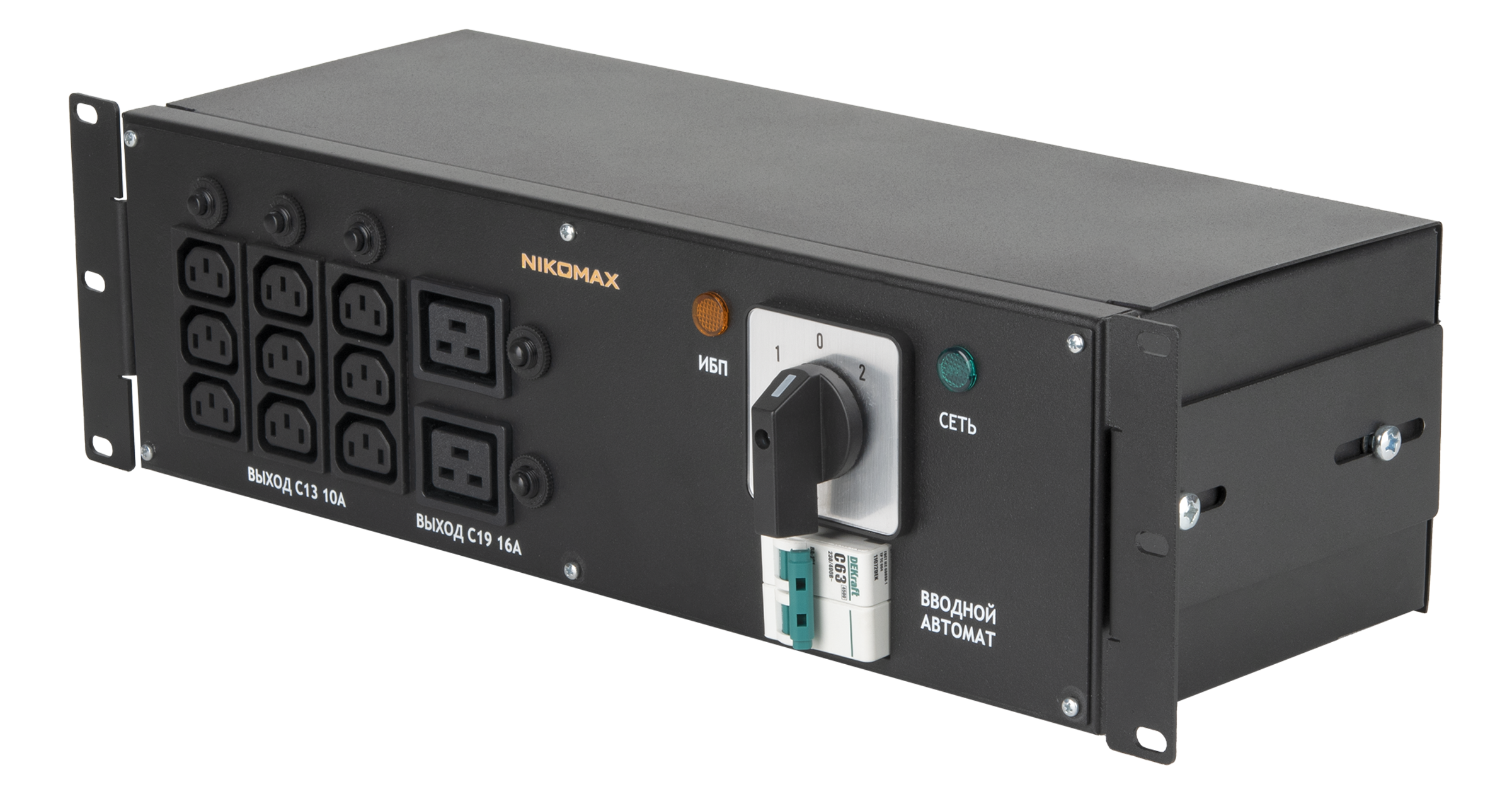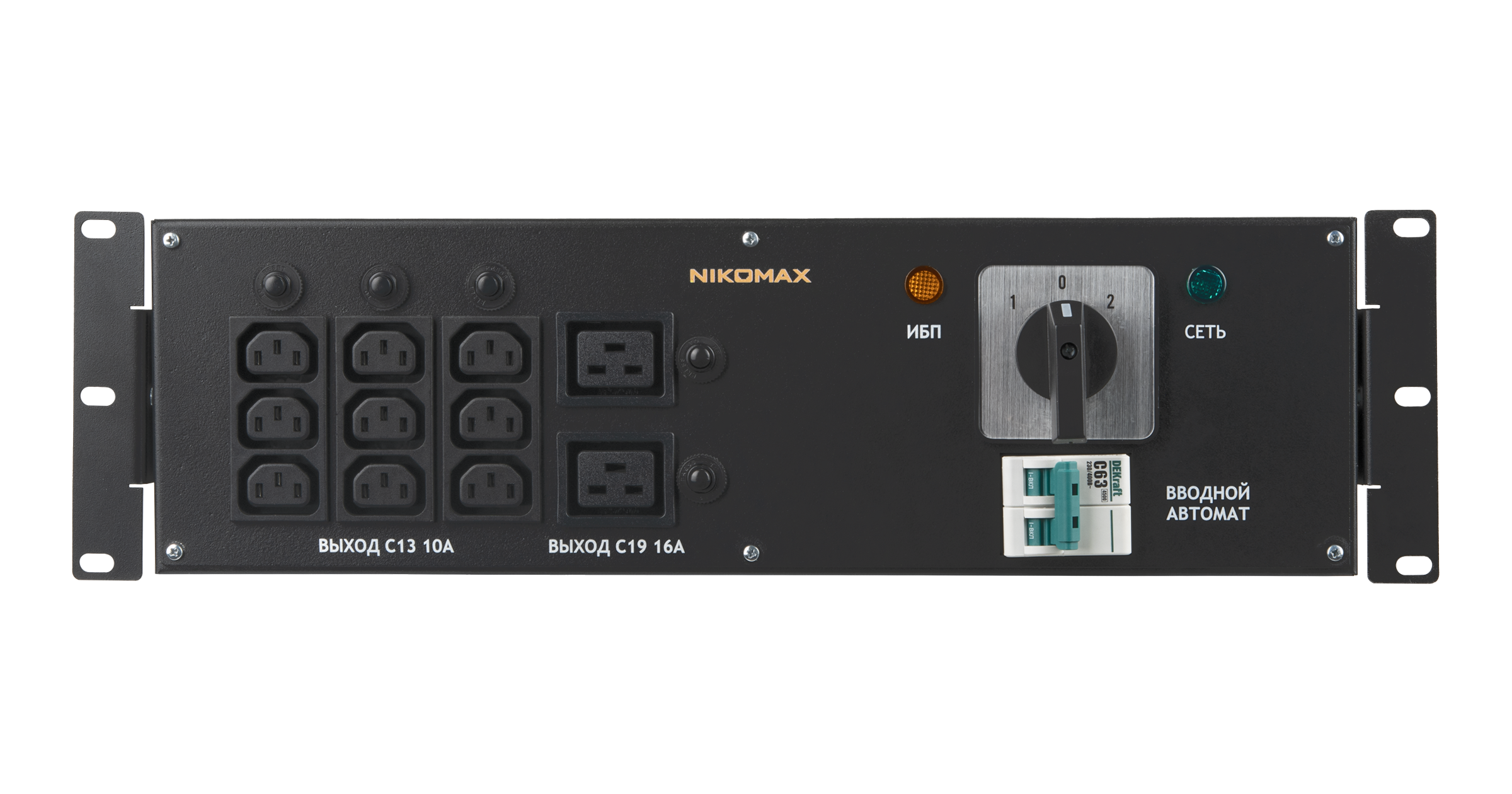 Внешний сервисный байпас для ИБП NIKOMAX, клеммный ввод L+N+PE, разъемы питания c защитным предохранителем IEC C13*9, IEC C19*2, кулачковый переключатель 63А, 3U