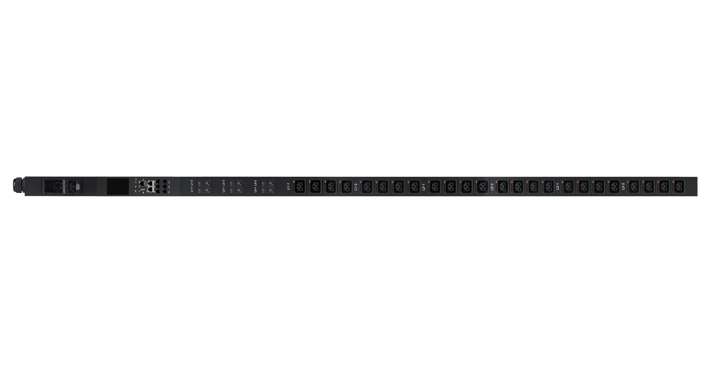 Блок контролируемых электрических розеток NIKOMAX, Серия MN (Metered-by-Outlet), вертикальный, 24 розетки C39 с фиксаторами, ввод 3 фазы, макс. нагрузка 63 А, кабельный ввод прямой, шнур питания 3 м, вилка 3-фазная 63А 400В, IEC 60309, цифровое измерение силы тока на входе, автоматический выключатель 6*32А, алюминиевый корпус, макс. мощность 47250Вт, 1820*64*56 мм, цвет черный.