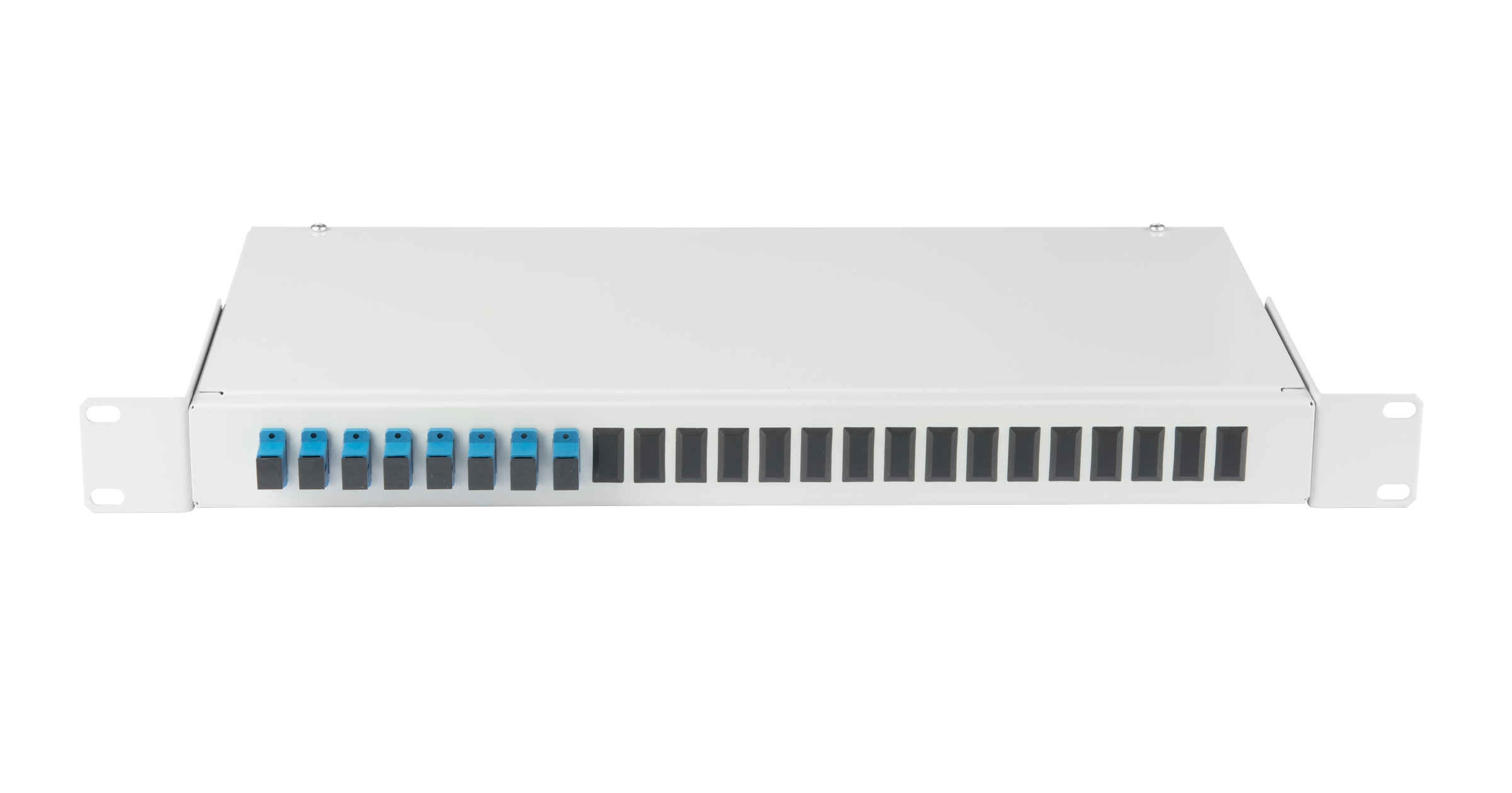 Оптический кросс 19", 1U, укомплектованный на 8 портов SC/UPC (8 одинарных SC/UPC адаптеров)