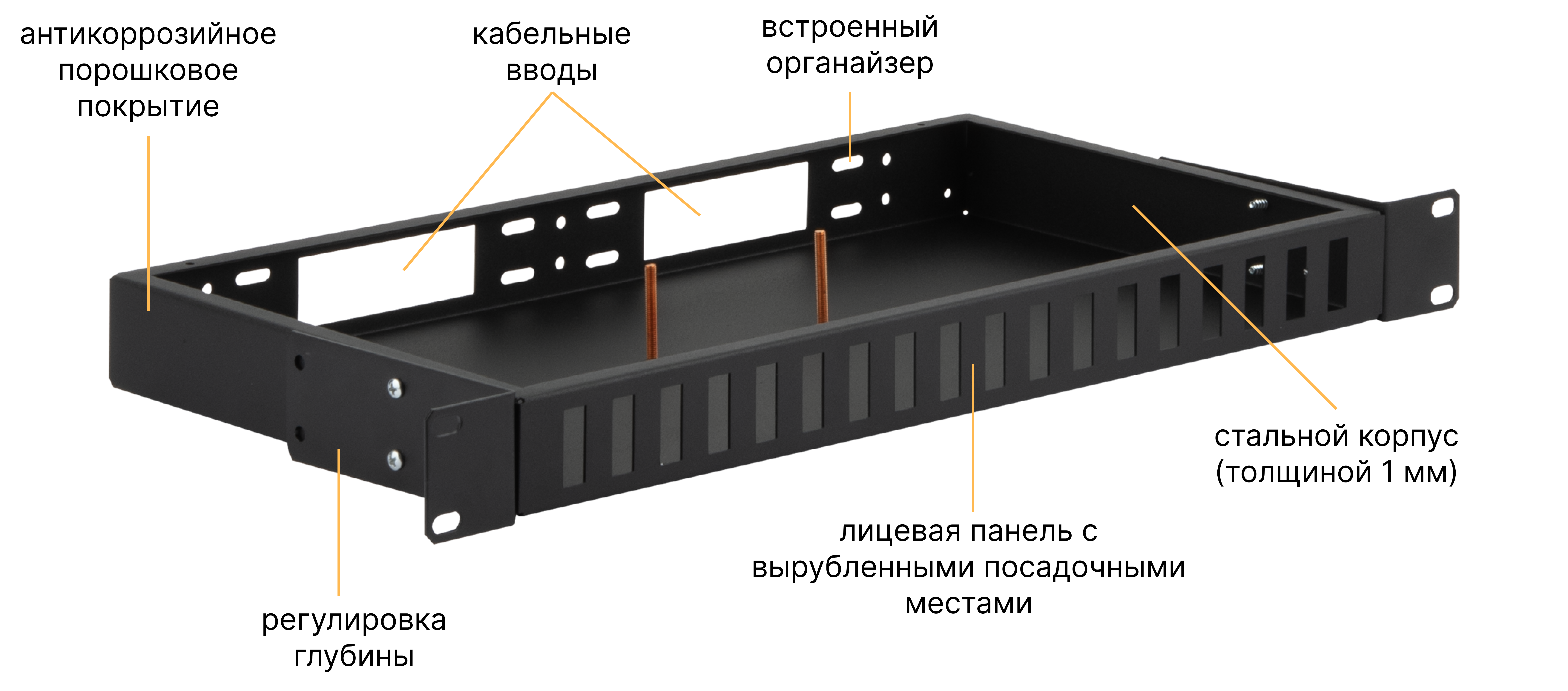 Его отличительными чертами являются универсальность конфигурации, возможность выбора глубины и типов адаптеров, улучшенная организация кабелей и конструкция из стали толщиной 1 мм. Эти характеристики делают его оптимальным выбором для проектов, где требуется экономичность без ущерба для надежности.