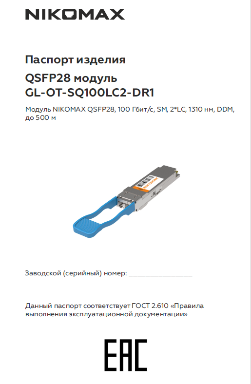 Модуль NIKOMAX QSFP28 DR1, 100 Гбит/c, Duplex, 2 ОВ, SM, 2xLC, 1310 нм, DDM, до 500 м