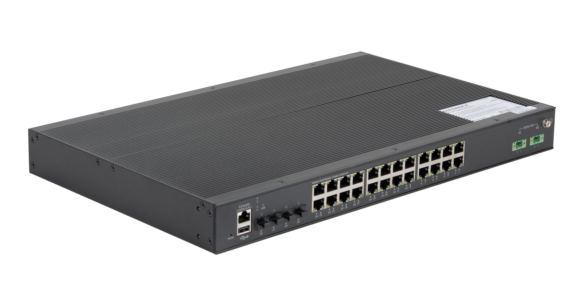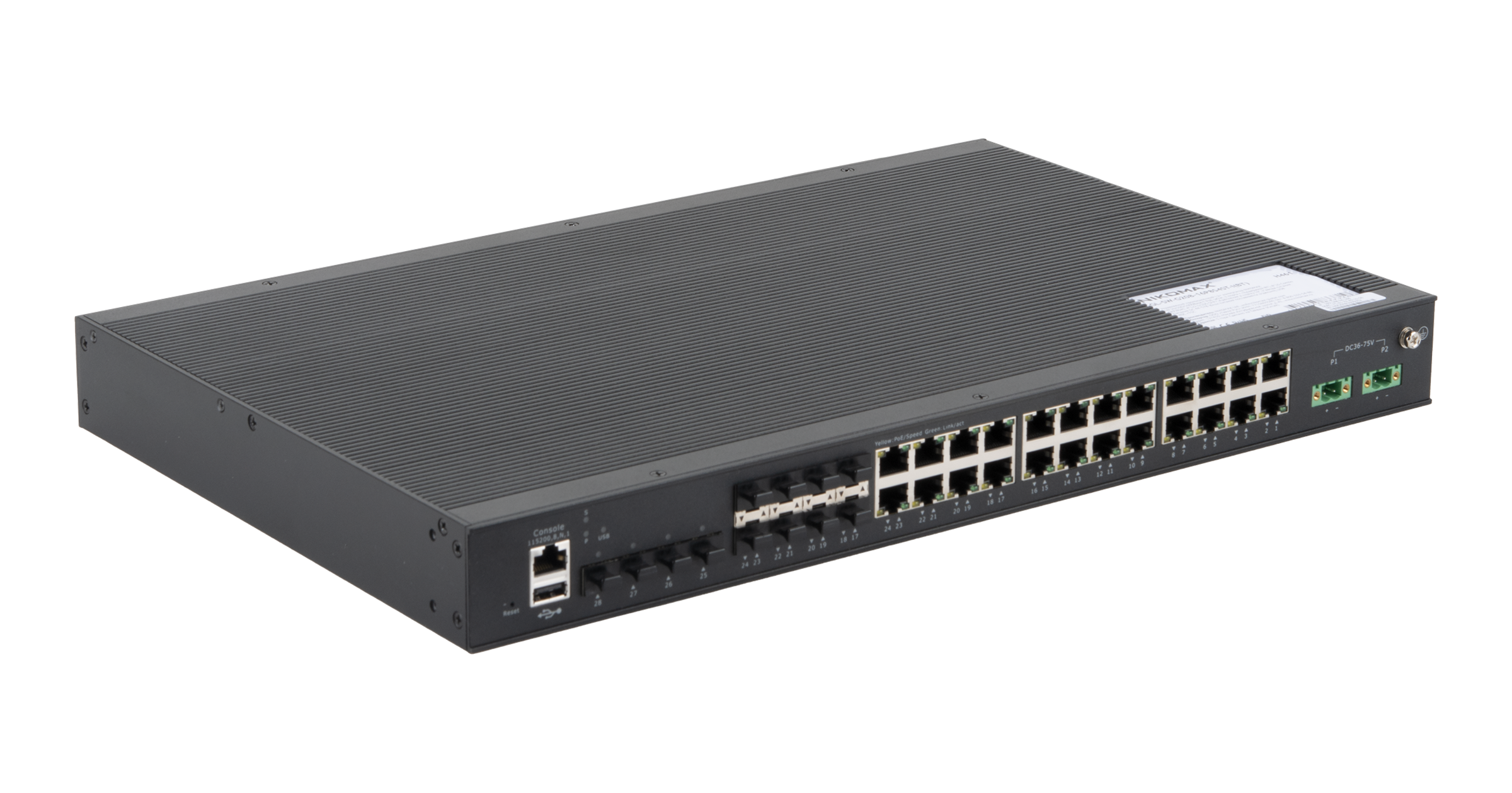 Управляемый промышленный L2+ коммутатор NIKOMAX, 24*10/100/1000Base-T PoE (af/at, 2 порта с поддержкой BT), 4*1/2.5/10G SFP+, Крепление в стойку 19", 2*ввода питания, питание DC 44-57В (блок питания поставляется отдельно), USB, -40С +75С